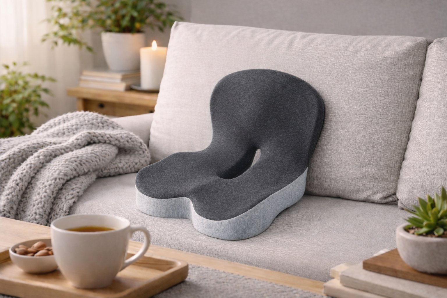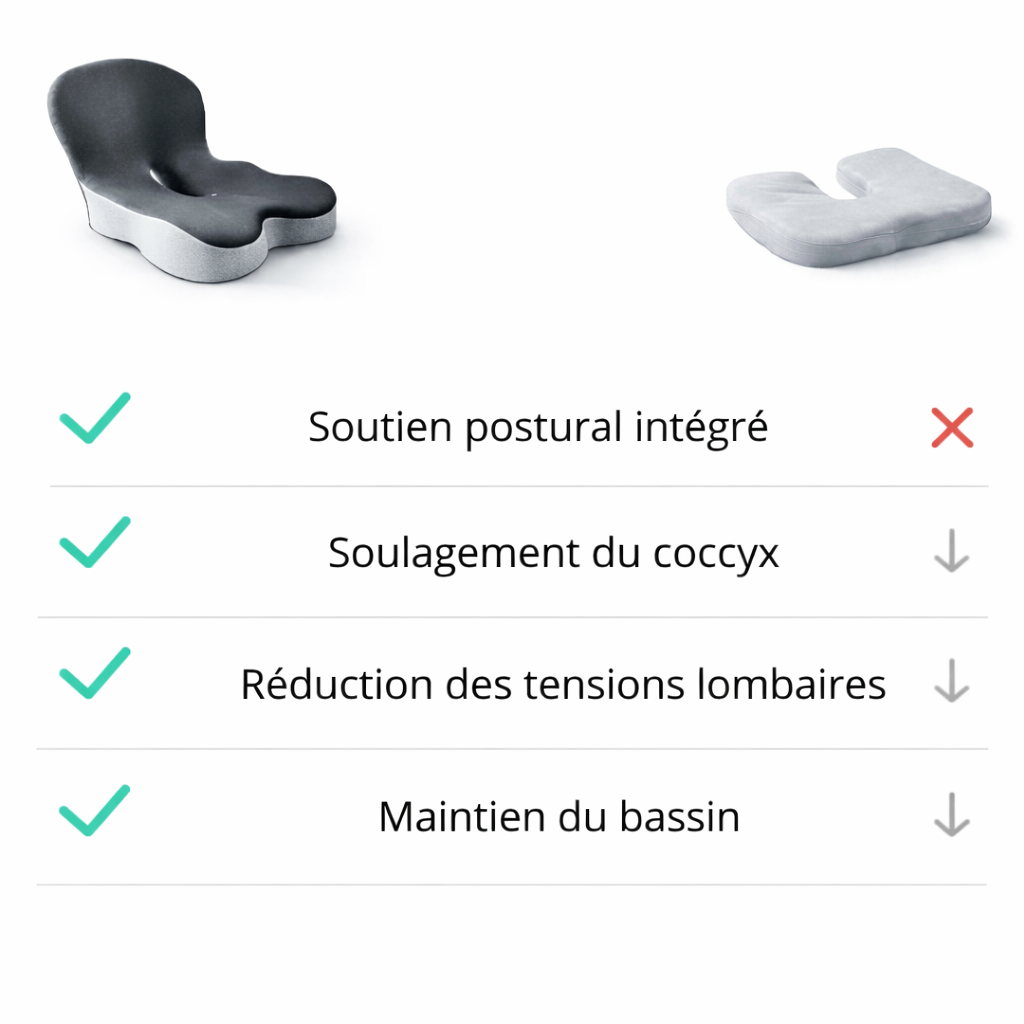 De nombreux coussins d’assise se contentent de soulager ponctuellement le coccyx, sans réellement agir sur la posture. Leur effet reste souvent limité et diminue avec le temps, notamment lorsque la mousse s’affaisse.